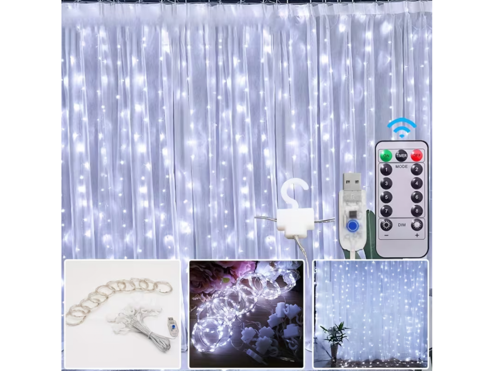 Гирлянда штора, 300 ламп, 3x3 м, холодный свет, usb в наборе пульт управления 5 режимов освещения